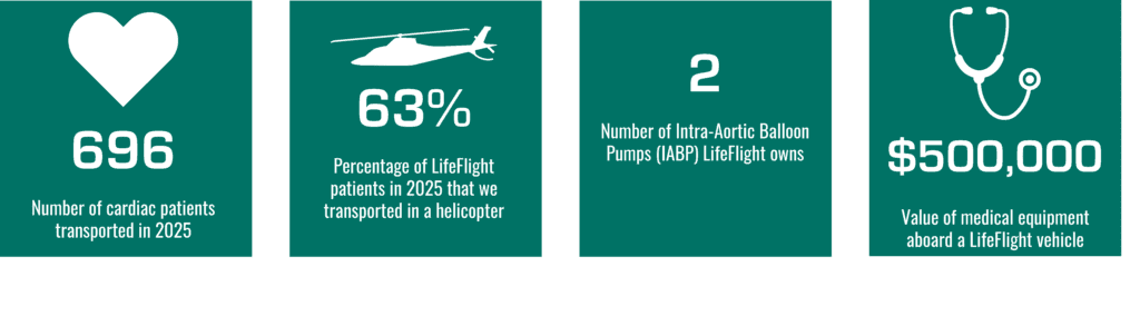 There is more than $500,000 of advanced medical equipment that accompanies each LifeFlight team. This includes equipment typically found in an intensive care unit and specially designed to fit and operate in an aircraft or ground ambulance. Each LifeFlight asset (helicopters, airplane, and ground ambulances) carries blood, a comprehensive pharmacy, a cardiac monitor, infusion pumps, a portable lab, a video laryngoscope, a ventilator, and an ultrasound, much of which is sometimes unavailable at smaller hospitals. When needed, LifeFlight also has isolettes for transporting infants and balloon pumps for transporting cardiac patients.