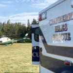 Representatives of Bangor Savings Bank and LifeFlight pose in front of a LifeFlight airplane
